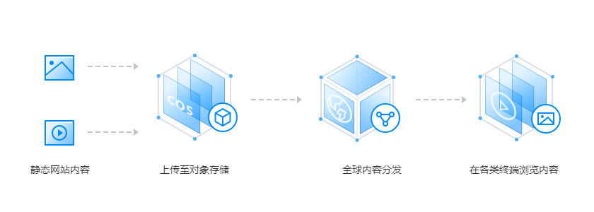 网站服务通常会在动态网页中,根据一定规则将经常变动和长期不变的资源区分开,静态资源就是指长期不变的非结构化数据资源。 标准存储提供了静态资源的存储和分发能力,减轻资源服务器的压力,并利用无限容量、高频读写的特性,为静态资源提供可扩展和可靠的存储。用户可以将网站中的静态内容(包括音视频、图片等文件)全部托管在标准存储中,并利用腾讯云 CDN 分发内容。结合腾讯云 CDN 全球加速节点的能力,可以将热点文件提前下发至边缘节点,降低访问延迟。