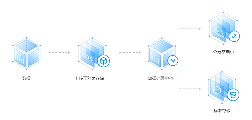 COS 支持与其他腾讯云产品联动,包括 CDN 加速、数据万象图片处理、音视频转码、文件预览等组件,提供「存储 + 处理」一体化解决方案。此外,COS 可作为大数据计算的数据池,为大数据分析与计算提供数据源;也可以结合 SCF 服务可以实现事件通知及自动处理。